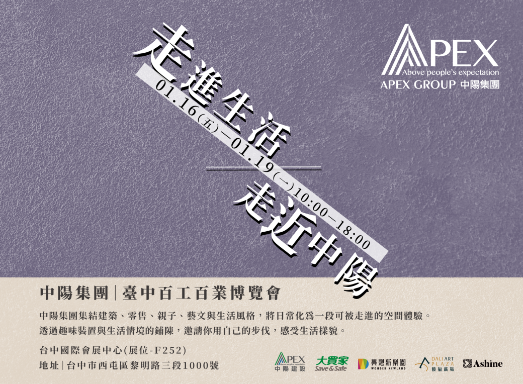 本次參展,中陽集團集結旗下品牌共同亮相,包括住宅開發的「中陽建設」、量販零售體系「大買家」、親子育樂品牌「異想新樂園」、結合餐飲、影城與多元服務的生活場域「大里藝術廣場」,以及生活風格選物品牌「Ashine」。透過跨產業角色的整合呈現,展區不僅展示各品牌成果,更描繪出一套完整且貼近日常的生活想像,讓參觀民眾得以從「住、用、陪伴、探索、品味」等多元面向,理解中陽集團如何在不同生活場景中,長期實踐對生活品質的承諾。
